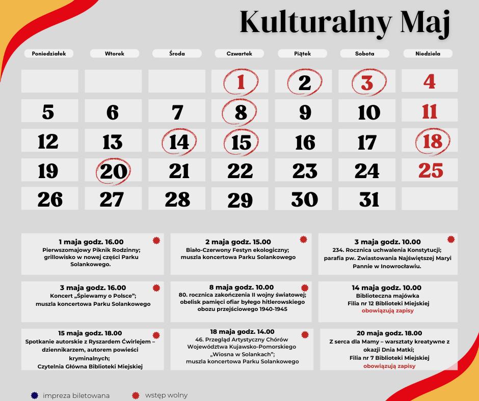 Maj w Inowrocławiu zapowiada się jako miesiąc pełen interesujących wydarzeń. Pogoda budzi się do życia, a coraz cieplejsze dni zachęcają do aktywności na zewnątrz. Idąc w parze z coraz lepszą pogodą, miasto przygotowało dla mieszkańców i odwiedzających wyjątkową ofertę kulturalną oraz sportową. Czeka na Was cała gama wydarzeń – od koncertów, przez spotkania autorskie, po imprezy sportowe.