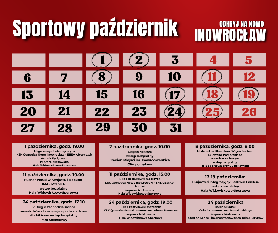 11 października, godz. 15.00; mecz koszykówki mężczyzn - 1LM KSK Qemetica Noteć Inowrocław – ENEA Basket Poznań, impreza biletowana; Hala Widowiskowo-Sportowa.