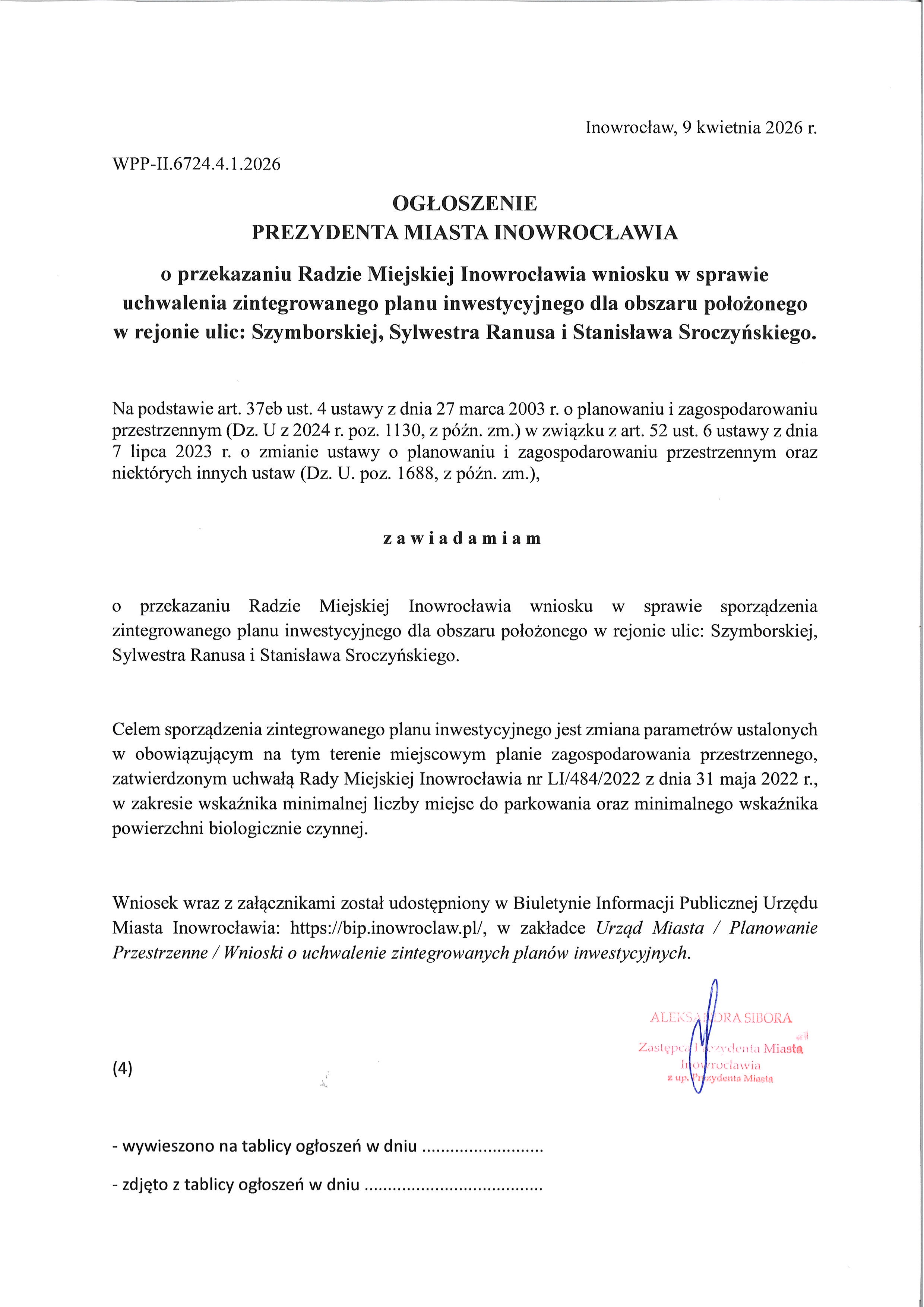 Ogłoszenie Prezydenta Miasta Inowrocławia o przekazaniu Radzie Miejskiej Inowrocławia wniosku w sprawie uchwalenia zintegorwanego lanu inwestycyjnego dla obszaru położonego w rejonie ulic: Szymborskiej, Sylwestra Ranusa i Stanisława Sroczyńskiego.